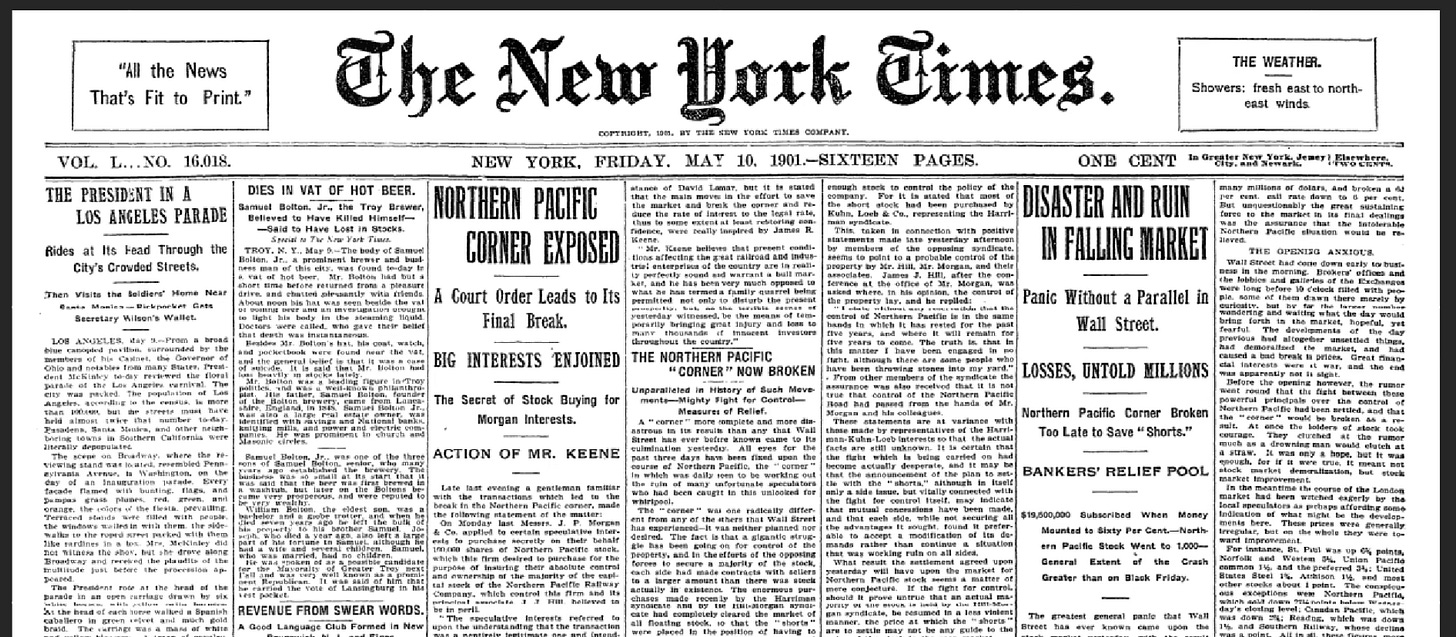 One of those cases was in May of 1901 when the Northern Pacific corner occurred.